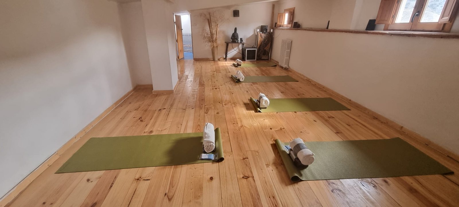 La sala de yoga se encuentra localizada en el ático de la Casa «El Tatarabuelo». Dispone de esterillas, cojines, sistema de sonido y mantitas además de otros útiles que se usan para el yoga. El suelo es de tarima de madera, por lo que es más cálido. Hay radiadores para el invierno por si se necesita poner la calefacción. También dispone de un pequeño aseo unisex al fondo de la sala para los clientes.