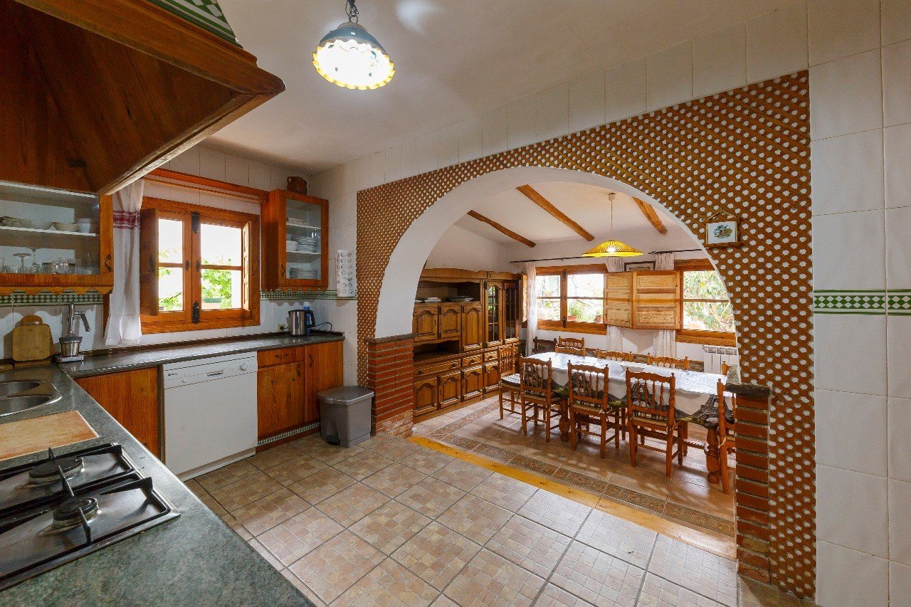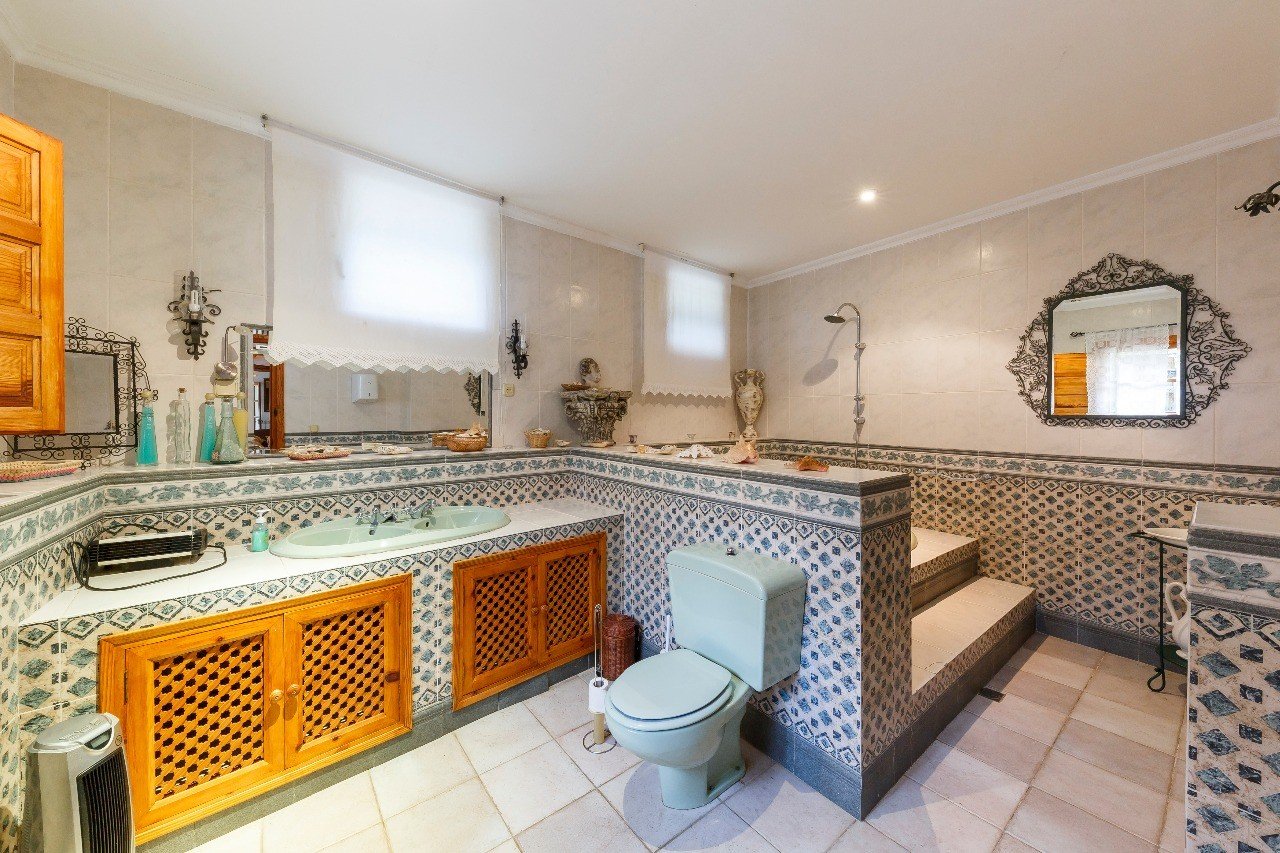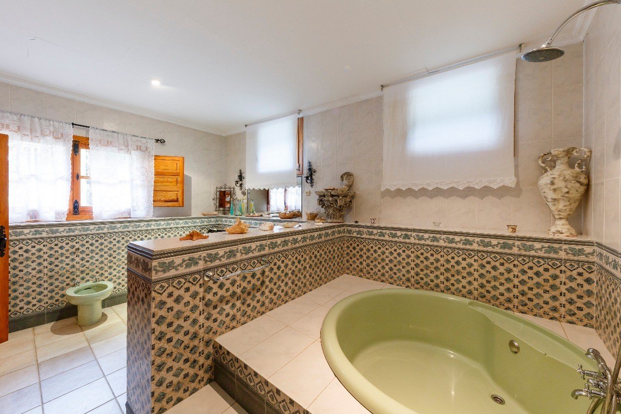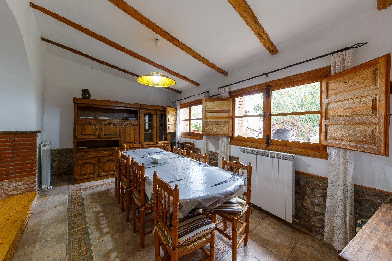 En la planta baja está el patio con acceso a las principales habitaciones de la casa. A su derecha está el comedor, cocina, despensa y cuarto de lavar. A la izquierda se sitúa un gran salón (50 m2) con chimenea y dos sofás-cama, ubicándose a continuación al fondo un baño de 10 m2. Desde el patio, la escalera de la izquierda nos conduce a las plantas superiores. Al fondo del patio tenemos también acceso directo al garaje