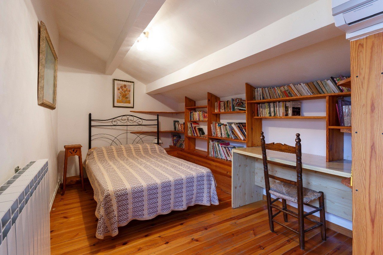 La primera planta consta de 3 dormitorios (de 20, 13 y 11 m2 respectivamente) con 4 camas (dos de matrimonio y dos individuales), y un segundo baño. Por una escalera de caracol puede ascenderse a la 2ª planta.